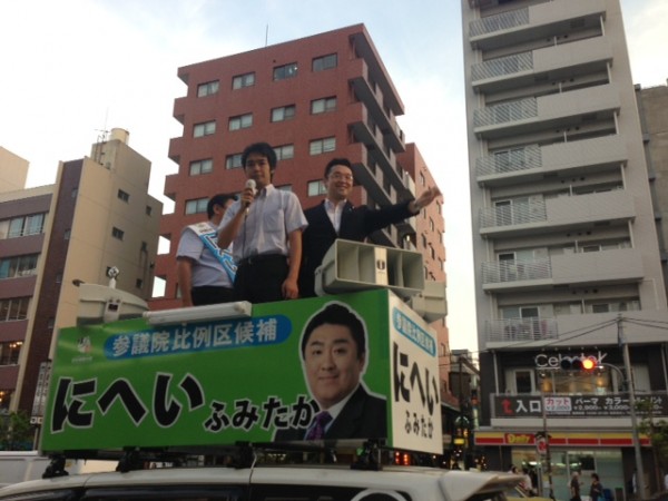 佳境の参議院選挙の応援演説に参りました。 左に写る方がにへい候補です(右は田沼衆議院議員)。よろしくお願いいたします。 真ん中は私です。初見の方もいらっしゃると思いますので、念のため申します。